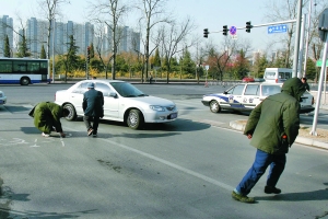 昨早8时,一辆金杯车从石景山路与上庄东街相交路口欲拐向去八宝山殡仪馆西门时,突然车上撒下许多硬币,两位中年人跑向路口捡钱,车辆不得不暂停。当另一辆车驶入八宝山殡仪馆西门时,再次撒硬币,两位老人迅速跑向车旁捡。
