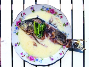 3. 洗净宰好的鲫鱼,刮去腹内黑膜,抠掉鲫鱼的咽喉齿(位于鳃后咽喉部的牙齿,泥腥味很重),沥干水分;