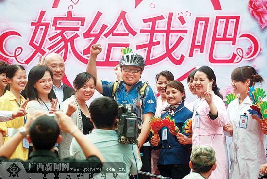 昨日(4月16日)上午,一名“全副武装”的户外骑行者出现在广西柳州市解放南路步行街上,吸引了市民们好奇的目光。他就是柳州登山女将孙延辉的男朋友邓宇,他将骑自行车进藏向攀登珠峰的女友求婚,并打算在珠峰脚下举行婚礼。