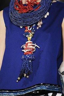 这串颈饰有些夸张,却富有创意。使用红白蓝三色搭配蓝色上衣,显得十分活泼,也充满了法兰西的浪漫。