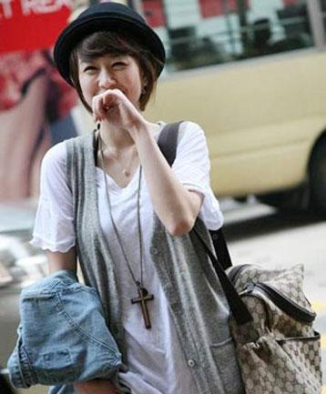 白色的基本款T恤搭配灰色针织马甲帮你修饰难看水桶腰,黑色的小礼帽让你将装扮玩味到底。