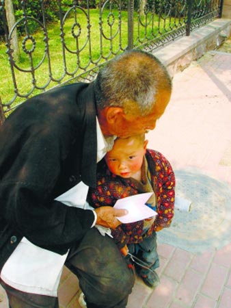 昨日,济南泉城广场西南角,坐着一名老汉,身旁一个小男孩在地上爬来爬去。记者正想上去问问,围观的一名大娘头一扭,压低声音和同伴说起了啥,记者竖起了耳朵,“这是祖孙俩吗?不是拐卖小孩的吧,还是装乞丐骗钱呢……好像是个残疾人呢……”错!人家是爷俩,不是祖孙俩!他们来济南是为了找工作。