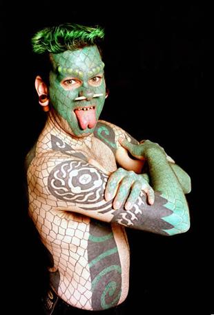 埃里克·斯普拉格,人称“蜥蜴人”,生于1972年,是“分割舌头”整容术的创始人,这种手术曾一度成为流行趋势。为了让自己看起来更像爬行动物,这名37岁的男子已经在纹身沙龙里度过了700小时。除此之外,他还在眉毛上方植入了10个特氟龙材料的“角”,并让牙齿变得更加锋利……