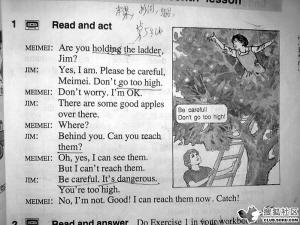 大家去学农去摘苹果,Han Meimei爬在梯子上,Jim就很紧张地在下面喊“Be careful!”(当年的英文教材)