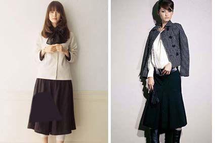 暗色圆领的外套加非褶裙可添加优雅感,此装扮,会显得身材纤细,白色衬衫是重点的点缀,给人清爽的印象,整体看起来也会不失优雅。