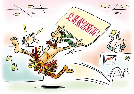 跑到办公室中间时,这名男子忽然将原本抱在胸前的长方形纸牌翻转过来,高举过头顶,上面用超大号的红字写着“交易量创新高”。