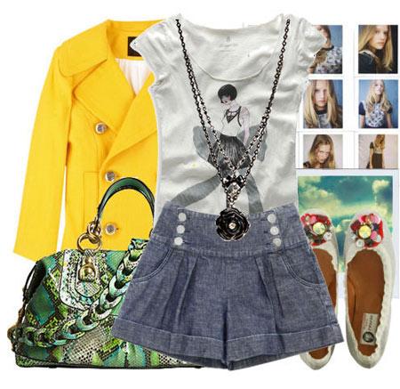 与海军风的高腰牛仔裙裤相搭配,加上香奈儿风格的山茶花长项链,打造年轻时尚。