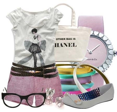 粉色短裤腰间扎上双层铆钉皮带,摇滚风格的混搭。