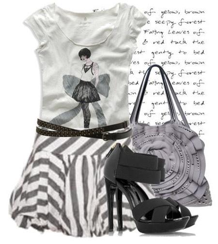 条纹高腰迷你裙加上缠绕式腰带,显出纤纤细腰,超高跟的脚踝凉鞋变身时髦女孩。