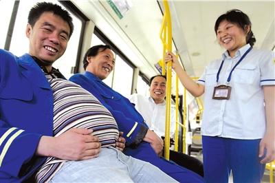 昨天上午,在北京站东街的639公交车总站内,突然多了很多“孕妇”集中乘车。为迎接母亲节的到来,车队让男司乘人员假扮孕妇,体验当母亲的辛苦。