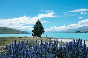 搁下行李我们一直向南而去,寻找皇后镇南端的人间仙景蒂卡波湖。寂静的湖面,四周覆盖着苍翠的树木和盛开的鲁冰花,加上对岸雪山倒影,四季美景浓缩一帘。缺水的新西兰岛国对湖水的利用可以说是费煞苦心,海拔700多米的高山湖泊,筑了7条人工导流明渠,不但用以截流灌溉,而且,还在每一出水口修建了水利发电厂,7座电厂为南岛的畜牧农渔提供了丰裕的清洁能源。科研人员还在截流湖中试养原本生活在大海里的“三文鱼”。第一次见到在淡水中游弋的“三文鱼”,怎不叫人嘴馋!花上10个纽币,我们吃上了活杀生食的淡水“三文鱼”。说实话,这人工饲养的淡水“三文鱼”太肥太油腻,口感和味道远差海水“三文鱼”一筹,但我还是由衷感到高兴,这毕竟是人类由渔到养的转变,“三文鱼”将永不枯竭。食罢鱼宴,不久,我们的车已驶入了新西兰著名的南岛水果园,红的樱桃、粉的水蜜桃、黄的杏子、绿的蛇果,五颜六色的累累硕果,挂得树条弯下了腰。为了充分利用水资源,每棵树下均有一条微型水管进行滴灌,昼夜较大的温差,明媚阳光的辐射和没有污染的洁净空气,给水果提供了优良的生长环境,来到了果园,人人现摘现吃。导游见我从树上摘下樱桃还要在自己T恤上蹭蹭,便告诉我说,不用蹭,这里的水果很干净。于是,我扔几粒入口,原汁原味。