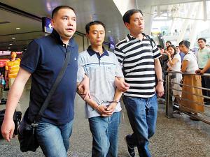 5月16日,江北机场,刘远(图中)被押解回渝。 本报记者 高科 摄