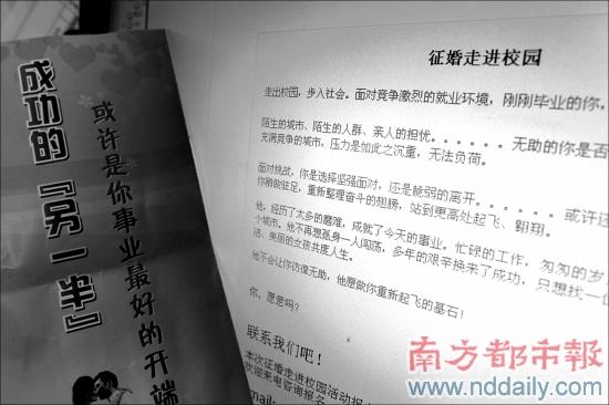 昨日,有网友在奥一网论坛发帖,称一家名叫做××缘交友网的公司最近几天在深圳大学女学生宿舍发传单,内容为“找到另一半,或许是事业最好的开端”,并且还在深圳大学荔园晨风BBS网站上发帖子,宣传“征婚走进大学校园”活动。该网友说,现在就业形势严峻,也确实有不少女生希望嫁个好老公改变自己一生,但觉得这样大张旗鼓走进大学校园征婚不合适。