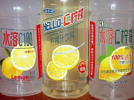 昨日上午,记者来到位于南环路的世纪联华超市,在2楼西面的货架上找到了农夫山泉的水溶C100、娃哈哈的HELLO—C柠檬、联华的水溶C柠檬这3种柠檬饮料。三种饮料的名称很相似,都打着以柠檬为原料、补充维C的旗号,而且外包装也大同小异,都是圆身长颈的瓶子,不仔细分辨很难看出来。其中两种,甚至瓶身上的宣传语都相同。超市还把这三种饮料放在一起销售,不少消费者表示,曾不小心拿错过饮料。