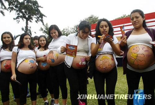 5月20日,在秘鲁首都利马,几名孕妇在腹部画上婴儿图案,参加“健康孕妇周”庆祝活动。新华社/路透