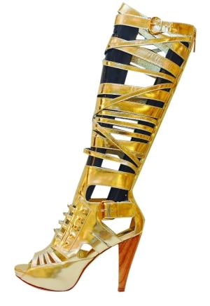 搭配指南:金色夸张的捆绑式高靴,因为本身就很复杂,所以身上的服饰最好以简洁为主。复古透明金鞋很百搭,休闲场合也能成为焦点。