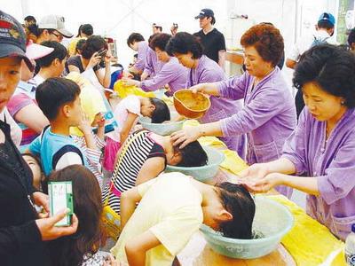 随后,朋友陪同记者参加庆祝活动,记者看到姑娘们用菖蒲根做成簪子别在头上,男人们则将菖蒲根缠在腰上。朋友说,这象征可以防止头痛和灾厄的发生。庆祝活动中有很多仪式,孩子用菖蒲水洗头发,祈求健康;人们点燃许愿灯,祝愿家人平安。来自农村的民俗表演是整个活动中最热闹的。小伙子舞动绘有龙图案和写有“农者天下之大乐”等字样的大旗,身穿韩服的人们边敲鼓边围成圈跳舞,一些人则装扮成小丑,穿插在队伍里,场面很热闹,他们用这种形式表达丰收的喜悦。朋友说,端午最有代表性的娱乐活动就是女性聚在一起荡秋千,男人聚在一起摔跤。端午当天,也有将晒干的艾叶放在大门旁边以除灾驱邪的习俗,韩国人喝菖蒲酒,还将扇子作为礼物赠送,不少商家趁此机会热卖扇子。
