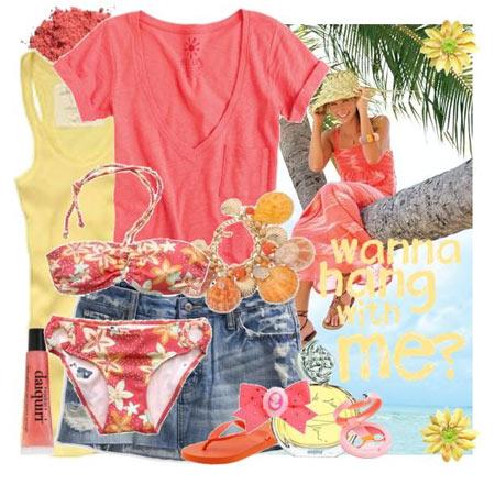 西瓜红色T恤搭配牛仔裙,海边风情的色彩搭配,T恤里面可以搭上同色系的花朵比基尼。