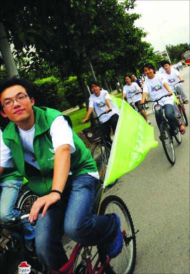 前日,百名高校环保志愿者发起“节能减排从我做起”环保行动,统一着装骑行插有环保宣传旗帜的单车,绕行广州大学城部分中心路段向路人倡导“”。