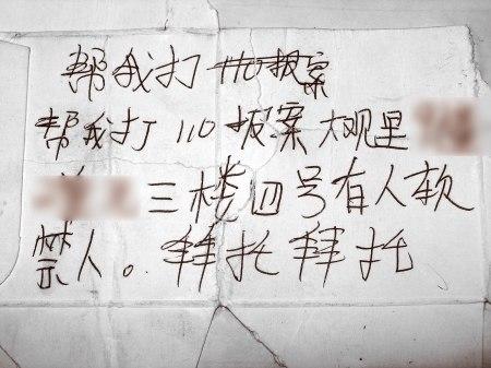 “帮我打110报案……有人软禁人,拜托拜托。”昨日下午2点,家住成都大观里某小区的一位大爷正在小区内散步,突然,一张硬纸条歪歪扭扭地从三楼窗户飘落下来,大爷拾起一看,大吃一惊,立即将纸条交给小区门卫。5名警察接警后立即出动……