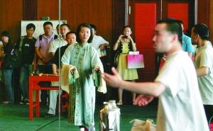 昨日,国家京剧院的排练馆里,6名演员在参观者面前认真对戏。隔壁,一名女演员“表演”着化妆、穿戴,准备唱一出“天女散花”,这些幕后工作平时并不对外开放。