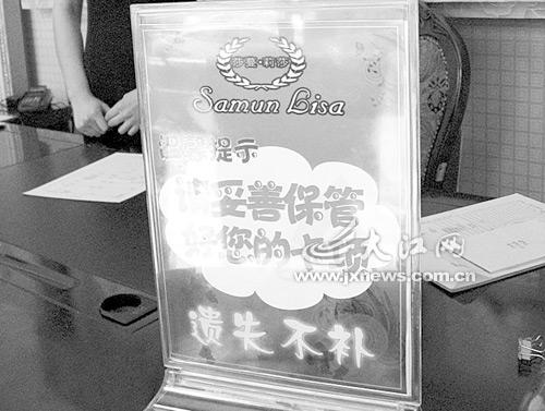 5月31日,记者陪同蒋女士来到莎蔓莉莎美容院。记者注意到,莎蔓莉莎美容院前台摆放的提示牌十分醒目,上面注明“请妥善保管好您的卡项,遗失不补,最终解释权归莎蔓莉莎美容院”。