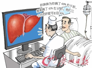 “患者亲妹妹为他捐了69%右肝、堂弟捐了45%左肝,供受三方均稳定平安,两位供体三个月后肝脏可再生回95%,完全可以恢复正常的工作、生活。”中山一院副院长何晓顺教授告诉记者,一切数据都是经过严格精细计算,“切多了供体会出现肝衰,切少了受体不够用。”他表示。