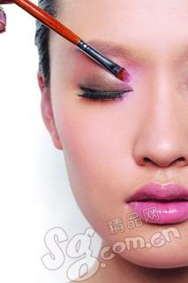 1.咖啡色眼影从眼角到眼中越来越浅,这才容易和粉色衔接自然,从眼头往眼中刷上珠光粉。