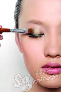 1.为了闪亮因子服帖自然,在原有的咖啡色眼妆上先按压一层珠光膏状眼影,再用刷子蘸取粉状珠光眼影打亮眼皮中央。