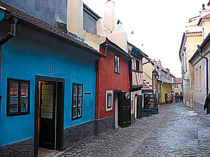 从修道院通往城堡的小街居然就是著名的黄金小巷。这巷子的出名其实是因为卡夫卡曾经住在这里,并完成了我们熟悉的小说《城堡》。黄金巷是一条由砖石铺成的街道,街道很窄,原是皇室仆役聚居的处所,后来这里聚集了很多炼金术师,黄金巷由此得名。