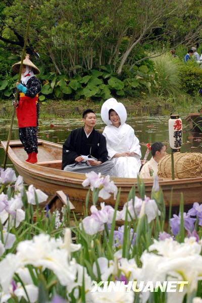 6月14日,一对身穿日本传统服装的新人在千叶县佐原市水生植物园内举行水上婚礼。新人乘坐游船顺水而下,两岸树木葱郁,沿途游客不断送去祝福。水上婚礼是佐原市独具特色的婚庆和观光活动。新华社记者孙巍摄