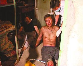 记者在一楼的后院见到了房主田先生,他浑身是血地坐在地上,后院水泥地上有一大摊血迹,旁边有很多碎玻璃。