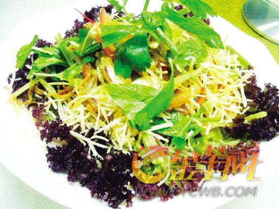 印尼黄姜具有祛湿、清热解毒、治疗动脉硬化的作用,对心血管系统的疾病也有较好的疗效。而南姜则可以帮助消化、壮阳,具有振奋、活化肌肤与抗自由基等多重特性。将青瓜、西红柿、芹菜、洋葱均切成丝状后,再加入特制的黄姜、南姜、辣椒(可根据自己的口味)凉拌而成的“丝丝入扣”,辣香清脆,既营养,又养生美容。