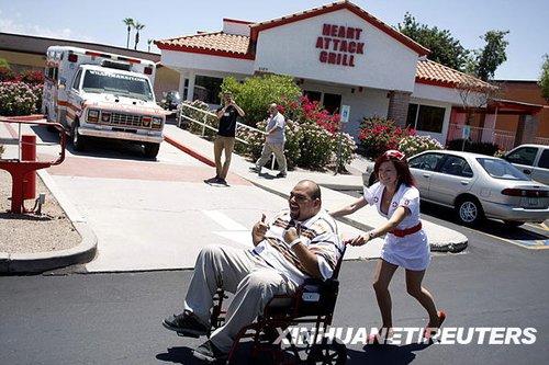6月17日,在美国亚利桑那州钱德勒的“心脏病烧烤”餐厅,女服务员用轮椅推着用餐后的食客离开。新华社/路透