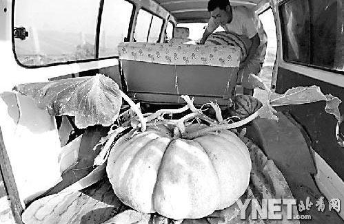 李凤春也是本届大兴西瓜的瓜王。据李凤春介绍,这个超大南瓜的种子是从美国引进的,经过四个月的生长期长成这么大。记者看到,南瓜呈粉白色,扁圆形,外形看上去与普通南瓜没什么区别,只是“型号”大了几十倍。摘下来后要3个大汉抬着才能搬动,放到“小面”车厢里几乎占用了多半个车厢。