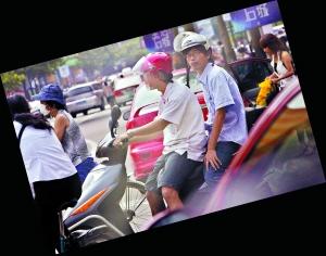 网友乘坐反扒队员的摩托车穿行于车流之中,寻找可疑人。