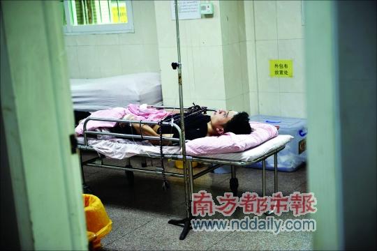 在番禺市桥医院急诊室内,撞车男子躺在病床上接受治疗,为了保证安全,警察用绳索将其身体固定起来。男子情绪已趋于稳定,只是因为之前的撞击,头部有明显伤口。