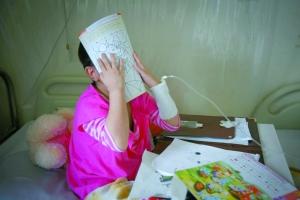 丹丹见到镜头马上用书将脸遮挡起来。5岁女童丹丹被确诊为急性重型再生障碍性贫血,入住北京道培医院准备骨髓移植。到昨日为止,她的父母已经“消失”9天了。本报记者 吴江 摄