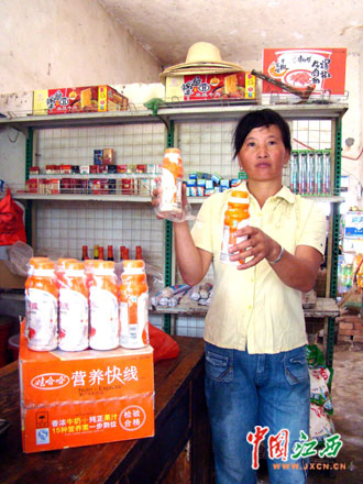 当日上午,记者驱车来到墩上村实地采访。今年41岁的邹根枝儿女都在外务工,和丈夫邹新海两人在家帮人装壳子板,每天120多元的收入让两人很是满足,平时除了吃饭外还特意买些原料补充营养。邹根枝介绍说:“6月20日,我从墩上村邹德水的便利店里买来一箱娃哈哈营养快线,当时怕饮料不新鲜,还特意看了生产日期,见是2009年5月31日生产的才放心买了回去,放在家里晚上看电视的时候喝,有些时候我老公(邹新海)也喝一瓶,但没有我喝得多。几天后,我感觉肚子不舒服,上吐下泻,为此专程搭车到万年县石镇街去买胃药,花了差不多200元钱病情却不见好转,而且肚子痛得特别厉害。没有办法,我只好到屋前的墩上卫生所去看病,打了几天吊针以后病情才有所好转。这次看病不仅花费了近400元医药费,还耽误了一个多星期没有干活,就连前两天插秧都是请人干得,我的损失可大了。”