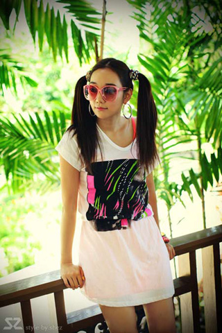 白色印花宽松T恤,内搭一件荧光粉红长吊带衫,就能当作连衣裙穿着。