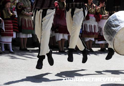 7月12日,在马其顿首都斯科普里以西约150公里的加利奇尼克村举办的一场传统婚礼上,身着民族服装的男子跳传统舞蹈。新华社/路透