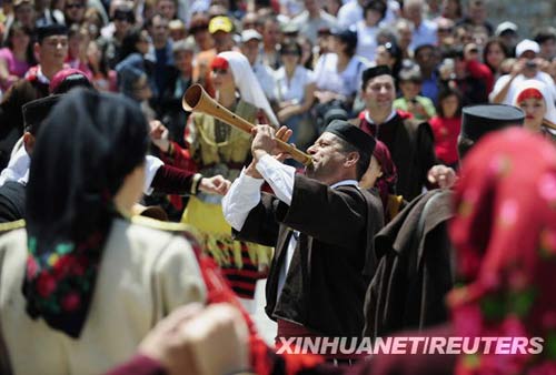 7月12日,在马其顿首都斯科普里以西约150公里的加利奇尼克村举办的一场传统婚礼上,一位身着民族服装的男子吹奏传统乐器。新华社/路透