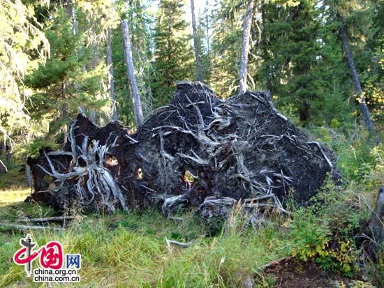 在喀纳斯湖最北端的入湖口,有一条千米枯木长堤是喀纳斯湖奇观之一。洪水时枯木长堤会飘起来,按理来说,这些枯木会向下游漂,但是多少年来,却奇怪的浮动逆流而上,长长地横列在喀纳斯湖的最上游6道湾。据说有人把枯木扔到下游5道湾里,那枯木还是执着地回到老地方,与枯木长堤连为一体。这是为什么呢?每当洪水季节,河水将上游大量的枯木携带漂入湖口,后因强劲的谷风在遇到喀纳斯湖南面的巨大山体后,风力变向将漂入湖水中的浮木推动着逆流上漂,日积月累逐步在湖口汇聚堆叠形成一条百余米宽、两千米长枯木纵横交错的 “千米枯木长堤”这一特殊的自然景观,这些枯木随着水的涨落而浮动