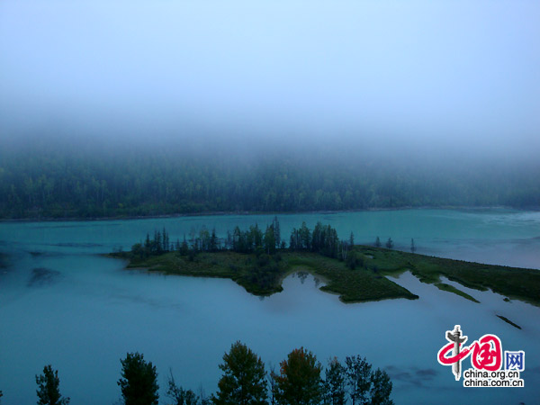 清晨登上山顶——观鱼亭,观赏日出景色,可见喀纳斯上空云海翻腾,雾涛升空,有时可看见如同峨眉山云海佛光那样的奇观。充沛的降水,凉爽的气候,使喀纳斯湖区常常笼罩在朦胧雾雹之中,而高出云雾顶部的山峰,则成了观看佛光的理想地方。