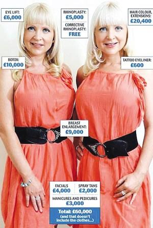 21岁那年,乔决定去做隆鼻手术。凯莉自然也不甘落后,于是照样学样。凯莉表示:“我们痛恨任何长相上的差异,所以我们不得不一同去做整容手术。”26岁那年,为了“熨平“额头上的第一道皱纹,姐妹俩双双开始定期注射肉毒素。2004年姐妹俩29岁那年,双双找到同一位整形医生,各花4500英镑接受了隆胸手术。有趣的是,由于姐妹俩长得形如“克隆人”,主刀医生为了防止“串户”,手术前不得不在她们各自的腹部上记上名字。这对孪生姐妹花迄今已经共同接受了不下6次美容手术,总耗资超过6万英镑。姐妹俩表示,她们无论做什么手术,都将指定同一位医生,以便让她们永远“难以分辨”。(宗 文)