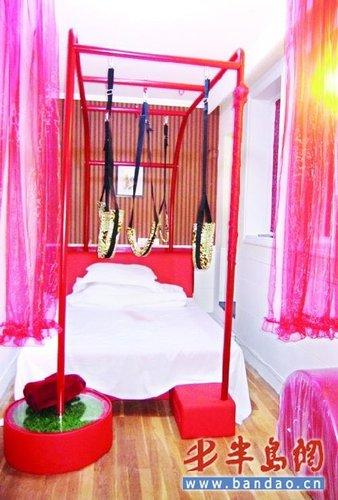 “这些床有的是电动床,有的是水床,睡上去十分舒适的,都是我们花几万元进的。床上的铁架子上可以挂上很多秋千,情侣们可以在房间享受荡秋千的乐趣。有的床边还有两根细柱子,是可以用来跳钢管舞的。我们还进了一批瑜伽球准备这几天充好气放在房间里。”说罢,崔先生把五个豹纹图案的秋千挂在床的铁架子上,展示给记者看。