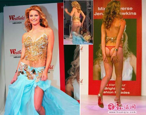 2004环球小姐冠军、澳大利亚小姐珍妮弗·霍金斯(Jennifer Hawkins)在一次代言走秀时遭遇尴尬时刻,长裙被高跟鞋的鞋跟绊住,在走台时突然滑落,性感的红色丁字内裤被一览无余,在众目睽睽下曝光好不尴尬。不过环球小姐冠军就是不一样,霍金斯并没有表现出惊惶失措的样子,也没有理会地上的裙子,而是三脚并作两步的走完T型台,她还用双手遮住自己性感的臀部以免曝光。而霍金斯事后显然对自己的临危不乱相当满意,环球小姐可不是浪得虚名,不仅要长得漂亮,更重要的是紧要关头能够有过人的冷静和智慧。