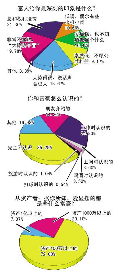 认为“现在的富豪很低调”、“大隐隐于市”、“发家清白”的网友,比认为“富豪一副势力相,嗓门比常人高八度”的网友多两个百分点。但在“和富豪是怎么认识的”这一项调查中,有25%的网友称自己在工作中结识过富豪。