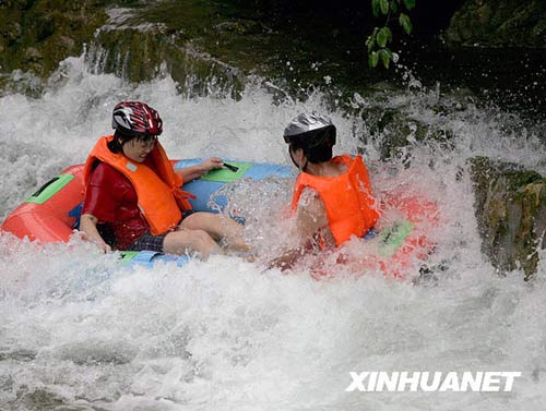 7月26日,一对男女在参加相亲交友为主题的漂流。当日,湖北宜昌一网站的相亲交友频道组织10对男女来到长阳土家族自治县兰草谷漂流,让他们在漂流运动中加强合作,增进了解,找到心仪的朋友。新华社发(王永胜 摄)