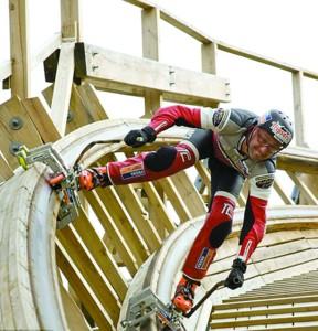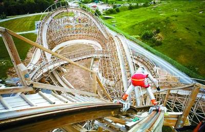 别看Dirk在过山车上 “风驰电掣”,十分风光,其实他冒着巨大的风险。当Dirk完成滑行后,他才长舒一口气。由于这次滑行的过山车是全木制的,都由钉子固定,在高速滑行的过程中,任何一个突出的钉子都会使他丧命。不过Dirk丝毫不介意所承担的风险,对他来说,这才是冒险的乐趣所在。